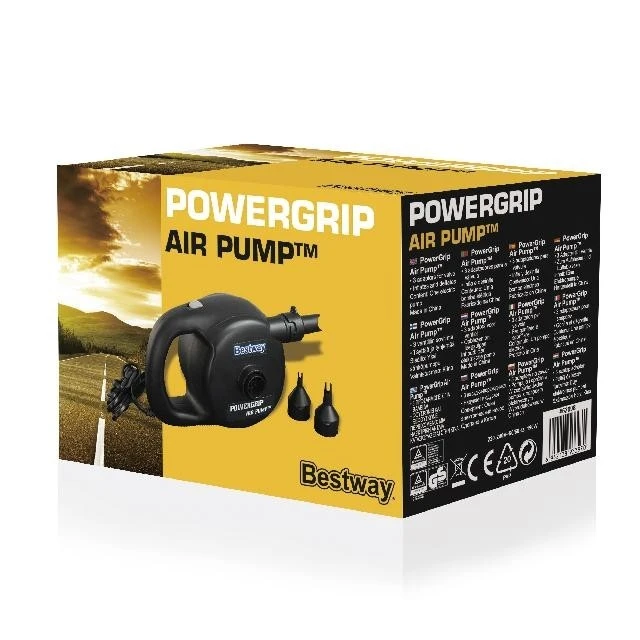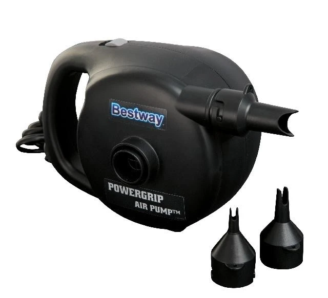 Electrische luchtpomp op 220 V. voor gebruik binnenshuis. Voor zowel opblazen als leeglopen. CE/EAC/GS gecertificeerd. Met 3 verschillende aansluitstukken.