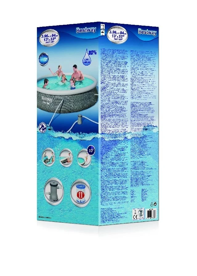 Het vertrouwde zwembad met opblaasrand, maar in een nieuw jasje. Dit zonder gereedschap te plaatsen zwembad heeft een bijzondere look: een rotan print. Gemaakt van DuraPlus materiaal, dus sterk en duurzaam en voorzien van aftapplug. Vlak stellen, eenvoudig de rand opblazen en dan vullen met water. Wordt geleverd incl. cartridgefilterpomp van 2,0 m³/u. Watercapaciteit: 7,340 ltr. Afmeting: Ø 396×84 cm.