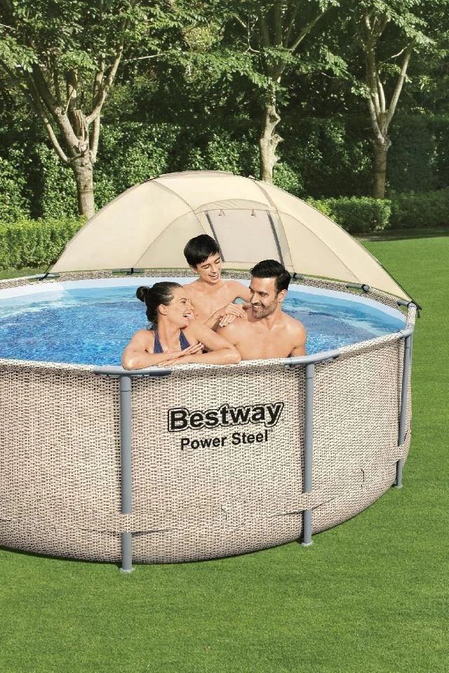 - Incl. Canopy Rond stalen frame zwembad met een rotan print en 2 m³/u cartridgefilterpomp (220-240V/12V) cartridgefilter type II). Opzetbare canopy wordt meegeleverd als zonnescherm voor afdekking in het bad. Met Seal & Lock systeem voor een veilige en stevige buisverbinding. Liner van DuraPlus materiaal, twee lagen PVC met een kern van polyester gaas voor extra stevigheid en duurzaamheid. Beschikt over een leegloopventiel met tuinslangaansluiting voor eenvoudig legen van het zwembad. Zeer eenvoudig op te zetten. Inclusief pomp, veiligheidstrap, canopy, Chemconnect dispenser en reparatie patch. Watercapaciteit (90%): 11.133 liter. Afmeting: 396×107 cm.