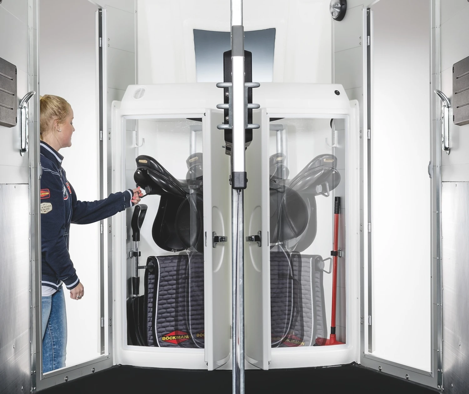 ruime zadelkamer met 2 binnendeuren en draaibare zadelcarrousel, schep, bezem en binnenverlichting