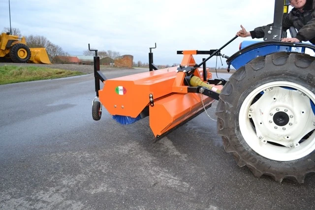 De machine kan eenvoudig schuin gesteld worden, door een flexibele topstang vangt de machine onregelmatigheden op. De veegmachine is uitgevoerd met opvangbak.