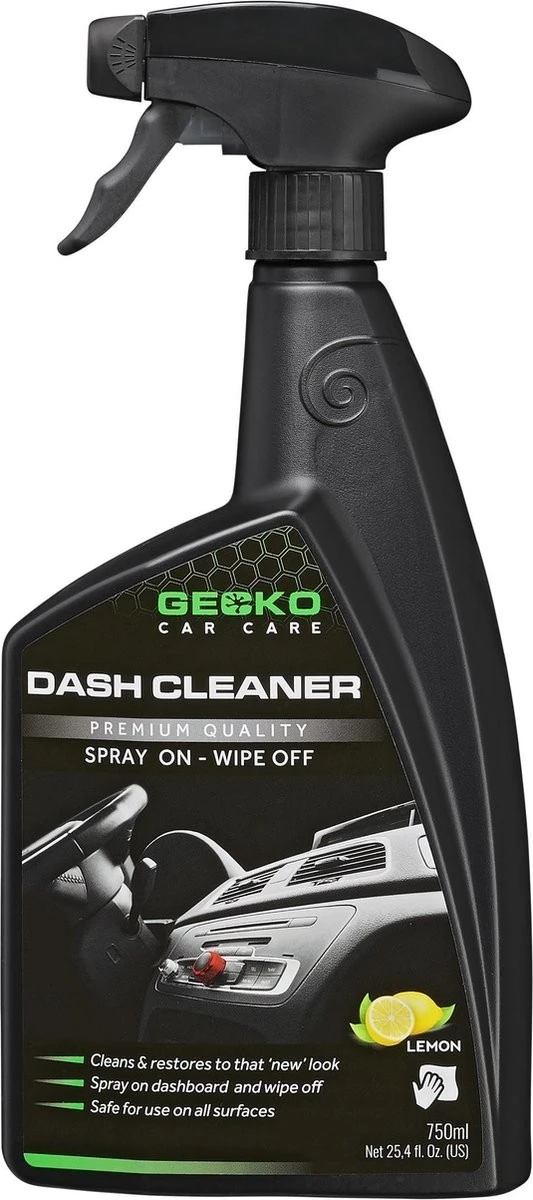 Spuit de Gecko Dashboard Reiniger met citroengeur op het dashboard en veeg het dashboard af met een zachte schone doek. Aanbrengen met microvezeldoek voor optimaal resultaat. Gecko Dashboard Reiniger is veilig voor alle oppervlakken.