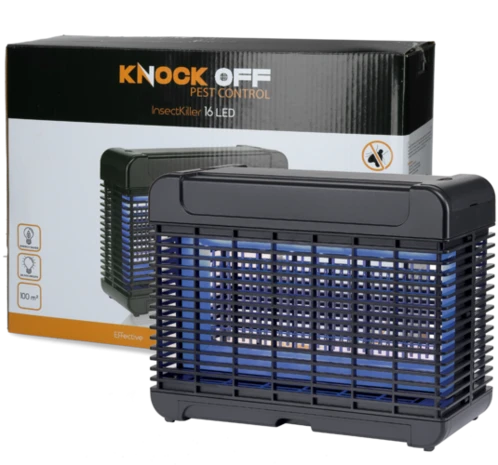 De Knock Off Insectlamp 16 LED vangt zowel vliegen, muggen en motten. De insectenlamp is voorzien van UV-A LED verlichting en een elektrocutierooster. Deze combinatie zorgt voor uitstekende vangstresultaten. De open vormgeving van de lamp geeft een optimale aantrekking vanuit alle richtingen. Zeer zuinig in gebruik en met een vangstbereik van 100 m2.