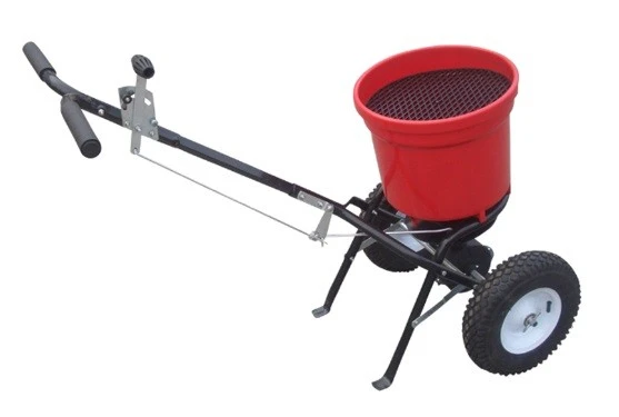 Strooier duwmodel Roteerstrooier Max. inhoud 25 kg – Luchtbanden Ronde bak met rooster om brokken meststof of zaad te verkleinen Debietregeling d.m.v. metalen stangen
