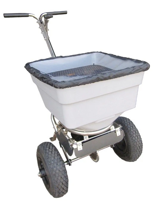 Strooier duwmodel Duwmodel zoutstrooier – Max capaciteit 45 kg 12� luchtbanden – Onderstel uit roestvrij staal Regelbare strooirichting d.m.v. kleppen Incl. afdekhoes en rooster.